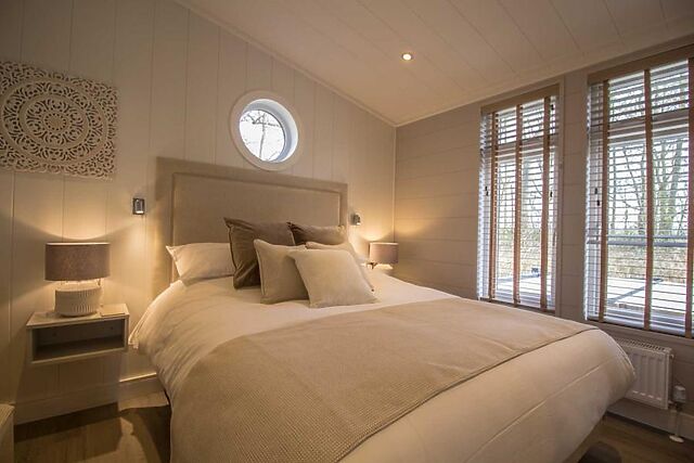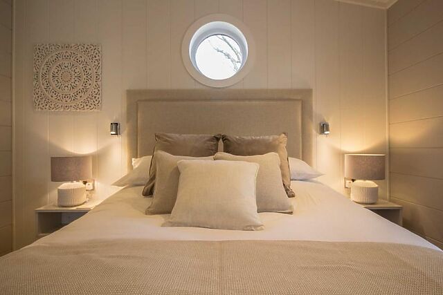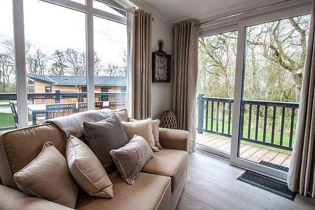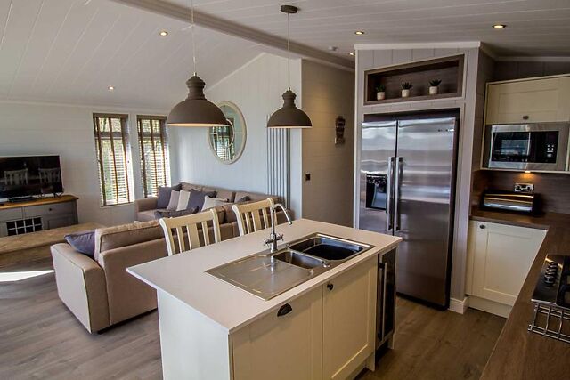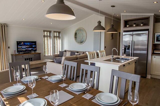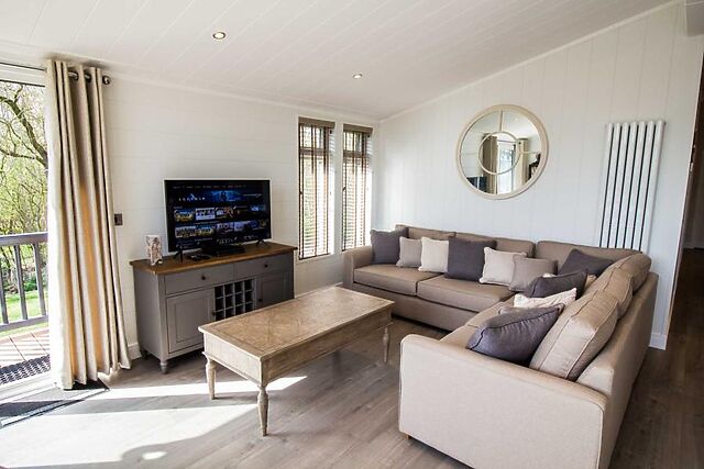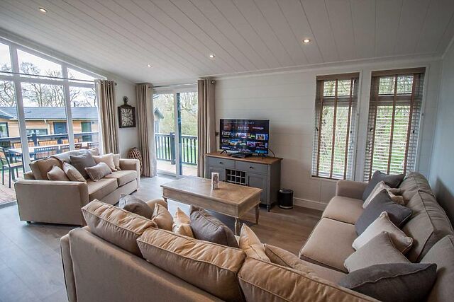 Step inside to discover an expansive open-plan living area, where cathedral-style floor-to-ceiling windows flood the space with natural light. The lounge features comfortable seating and a large Smart TV, making it a perfect space for cosy evenings.