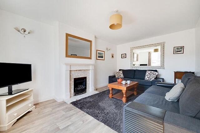 Walk through the hallway to reach the neutral-toned lounge with two plump contemporary sofas around a coffee table plus an elegant feature fireplace and a TV. After relaxing with your feet up with some music on the Bluetooth speaker cook a special meal for your loved ones in the traditional kitchen with shaker-style cabinets, sparkling surfacetops and a wooden dining table with seating for six.