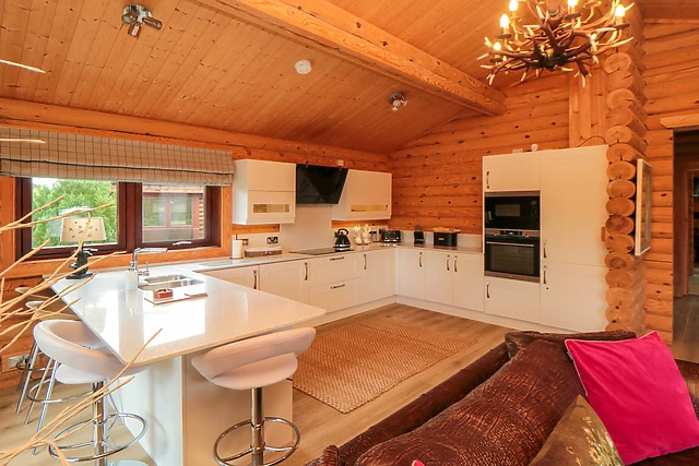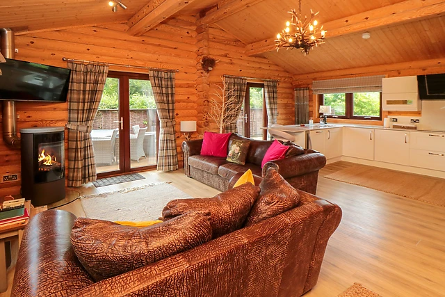 Enter into a charming open-plan living space, hosting a sitting area which encourages guests to recline beside the LPG woodburning stove and warm their feet, as they plan the day ahead of them. The kitchen hosts plenty of home-from-home amenities to cater to your culinary needs, and you can enjoy mealtimes together at the dining table.