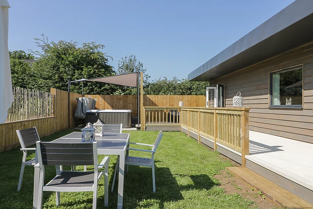 Yes, the property features a luxurious hot tub, perfectly situated on the decking area for guests to unwind and enjoy a relaxing soak during their stay.