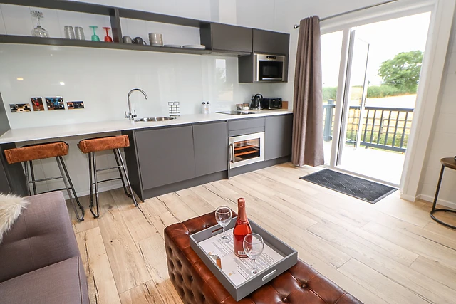 Upon arrival, you will find plenty of off-road parking, as well as a lovely front patio boasting seating and a bubbling hot tub, perfect for relaxing soaks under the stars. Be welcomed into the open-plan living space, where you will find a well-equipped kitchen for rustling up tasty dishes, ready to enjoy at the breakfast bar for two over a chilled bottle of wine, courtesy of the wine chiller.