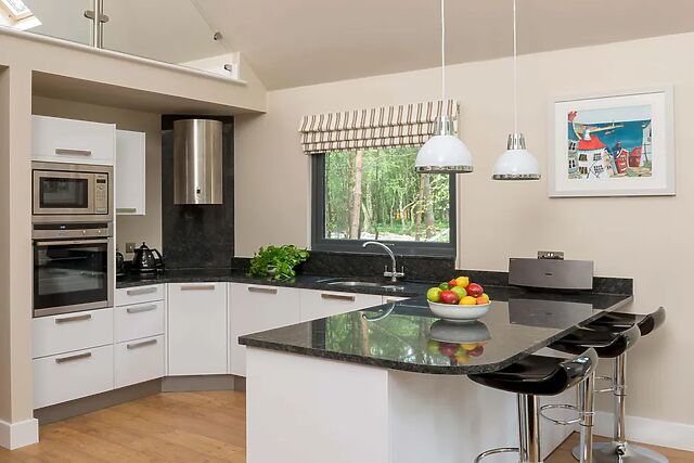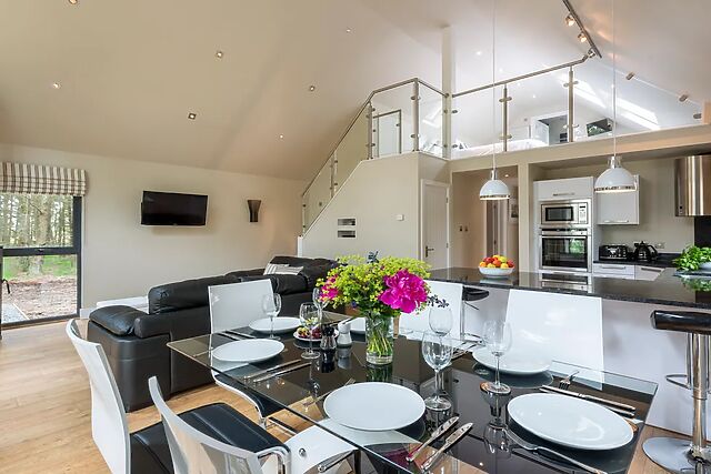 The lodge boasts an open-plan living area bathed in natural light, with floor-to-ceiling windows that invite the outside in. The kitchen is equipped with granite worktops and high-quality appliances, while the dining area offers a picturesque setting for leisurely meals.