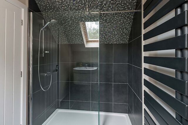 The elegant bathroom features a freestanding bath and separate shower. Upstairs, the mezzanine-level master bedroom with an en-suite shower room provides a luxurious retreat.