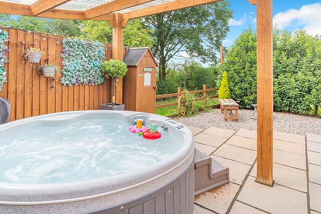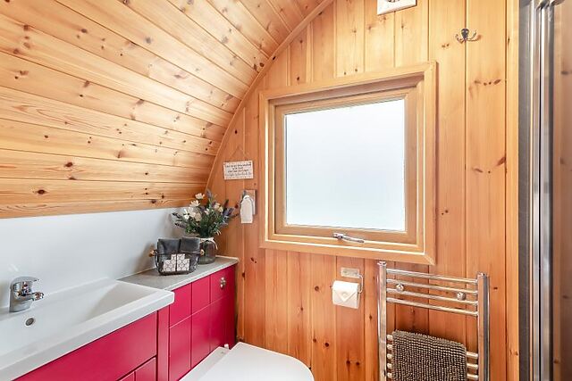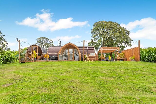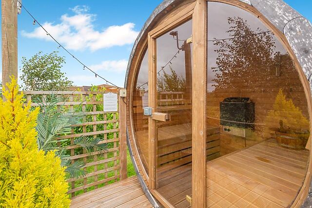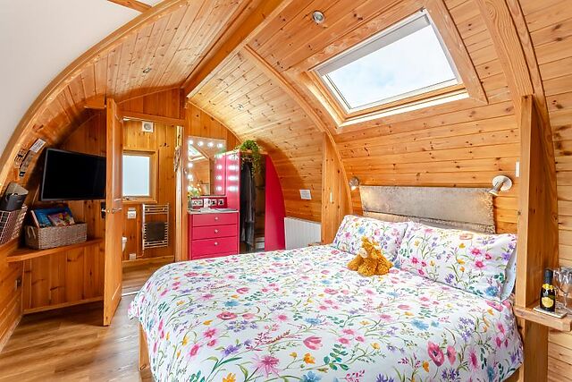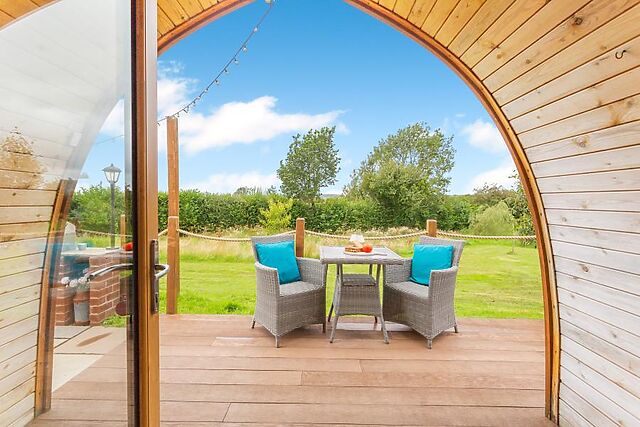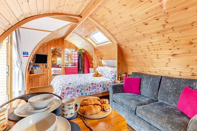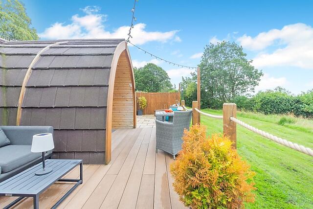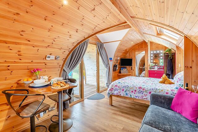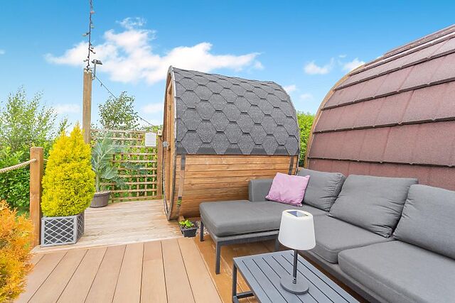 At the heart of the room is a sumptuous king-size bed with ample storage space and a refreshing en-suite shower room. Stepping back outside, the pod has a lovely decked area with comfortable seating, a sauna, a covered hot tub and BBQ with a fire pit.