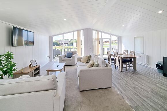 There's also a family bathroom with bath and shower over. The open-plan living area has a Smart TV and patio doors leading to the decking.