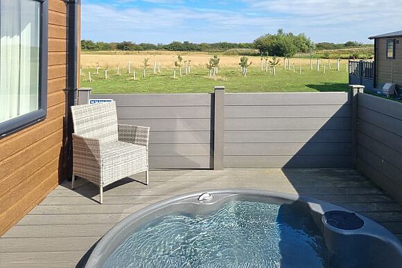 A private hot tub for four sits on your own decking perfect for evening soaks with complete privacy.
