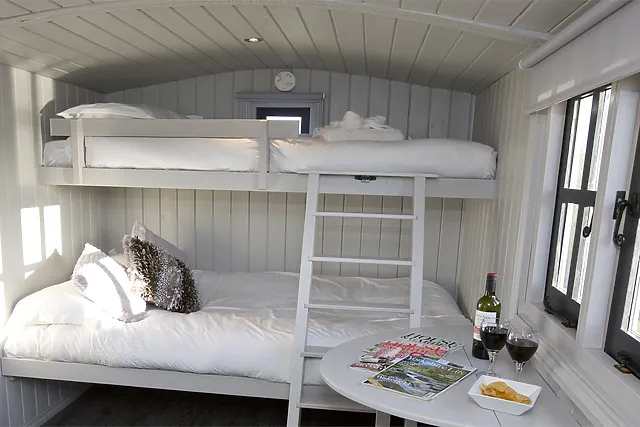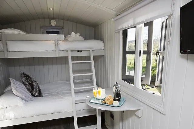 The shepherd's hut comfortably sleeps up to 3 people, with a double bunk bed and a single overhead, suitable for small families or couples.
