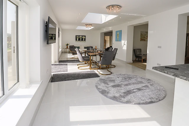 Travel up the gated driveway, with plenty of space for four cars, taking in your elevated position that enjoys far-reaching, rural views. Step indoors and make your way to the open-plan living space, with porcelain tiles underfoot, and plenty of state-of-the-art appliances throughout, offering a light, airy and opulent feel.