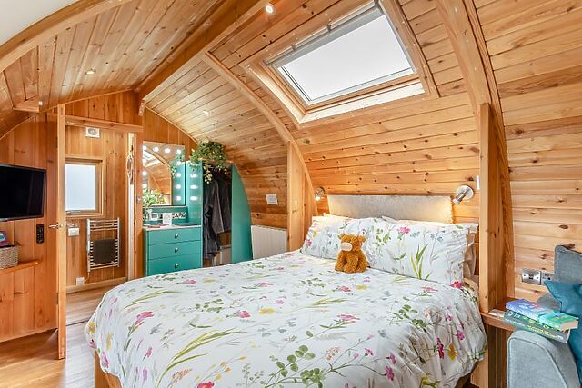 The Smart TV sits directly opposite the king-size bed – ideal for snuggled-up movie nights. A wood burner-effect electric fire casts a soft, warming glow for relaxing evenings indoors.
