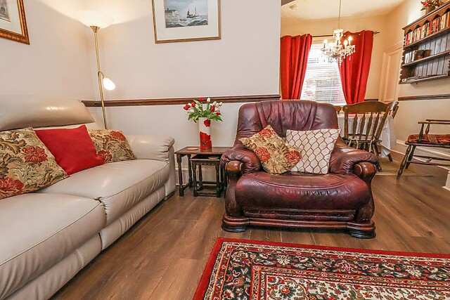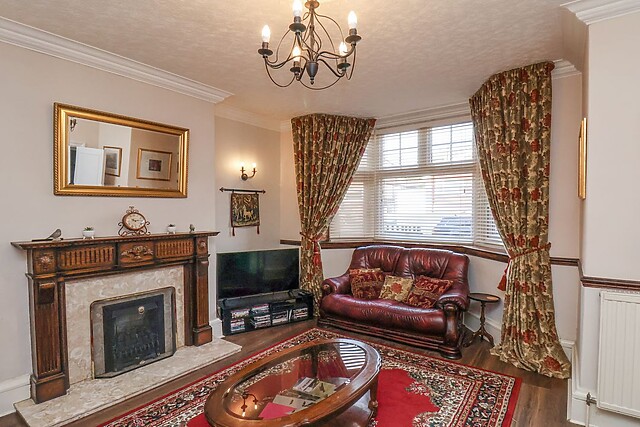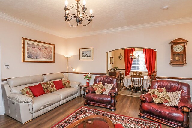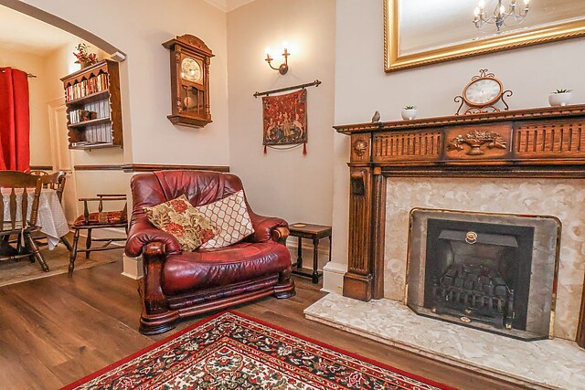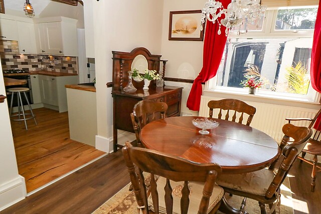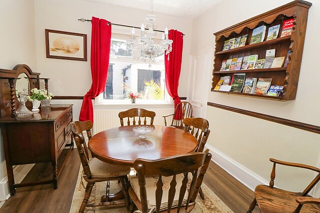 On the right is the doorway to the sitting room which is tastefully decorated with chandelier lighting, leather sofas and arm chairs to relax on and a large bay window adding to the spacious feel of the room, while the feature fireplace complete with gas fire gives a cosy feel. Heading straight through to the dining room with seating for six, antique furniture with a selection of books, games and DVDs, this is the perfect place to gather for meals together, or to just sit quietly in a chair and enjoy a good book.