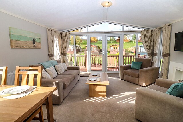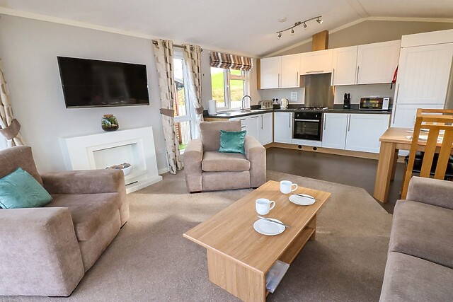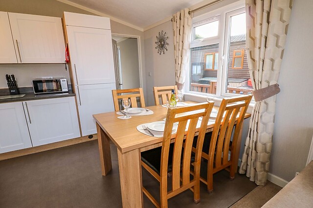 Upon entering this single-storey lodge, you will be greeted by a spacious open-plan area, thoughtfully designed to cater to all your needs. The kitchen is well-equipped, ready for you to prepare your favourite meals, which can be enjoyed at the dining table set for four.