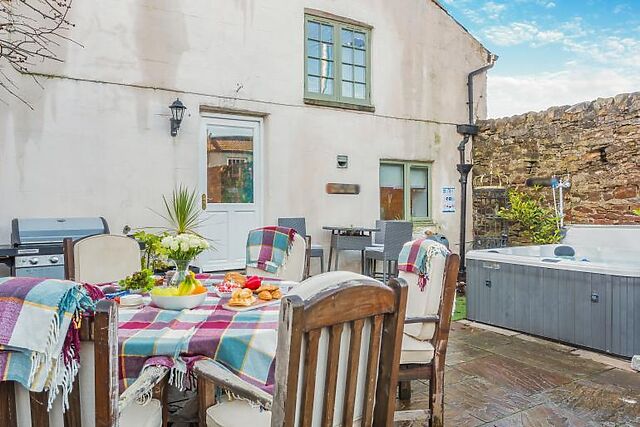 Down the hallway, there is a large family bathroom with a bath and WC. The pretty, enclosed courtyard garden is the perfect venue to host a get-together with a BBQ, patio furniture and a bubbling hot tub.
