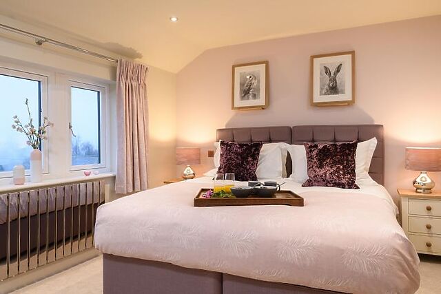 The cottage features three beautifully decorated bedrooms, including a super king-size, a king-size, and a versatile zip-and-link room. Each bedroom comes with a Smart TV, and the master en-suite even boasts an Aquavision TV in the bath. The ground floor includes a king-size bedroom with step-free access and an en-suite shower room.
