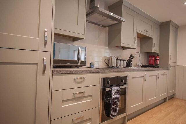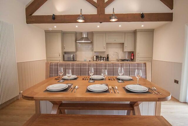 Make your way inside and into the spacious, open-plan lounge/kitchen/diner, with its vaulted and beamed ceiling. Head over to the kitchen to rustle up meals, a space that has been designed to ensure you have everything you require at your fingertips for self-catering during your stay.