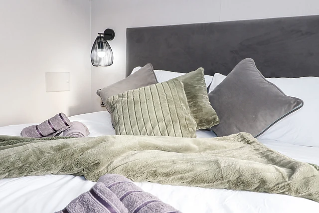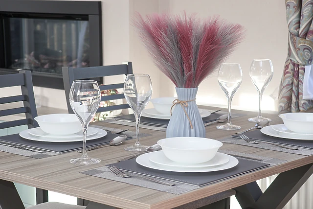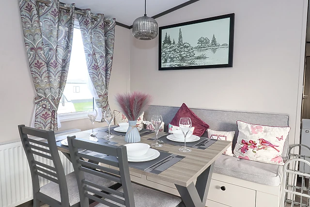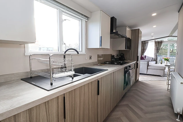 Park up outside or take advantage of the additional parking area, before ascending the external steps to reach your decked space, designed with alfresco dining and relaxing in mind. Be impressed by the open-plan living space, where you can prepare meals in the sleek kitchen, gather as a four around the dining table, and lounge upon the corner sofa, with an electric fire for added warmth.