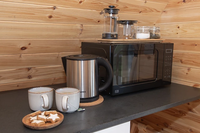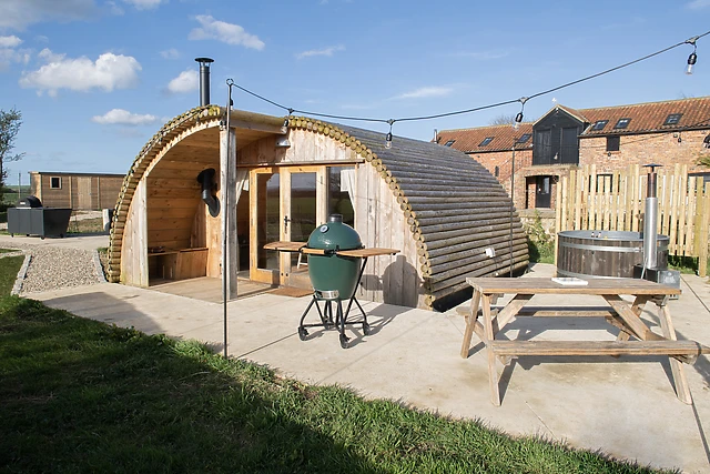 Glamping Pod 3 Harmony, a delightful holiday hut is tucked away in the tranquil village of Lebberston, North Yorkshire. This single-storey pod boasts a luxurious wood-fired hot tub, ideal for relaxing under the stars, and a well-presented studio-style living space with small kitchen and sitting area.