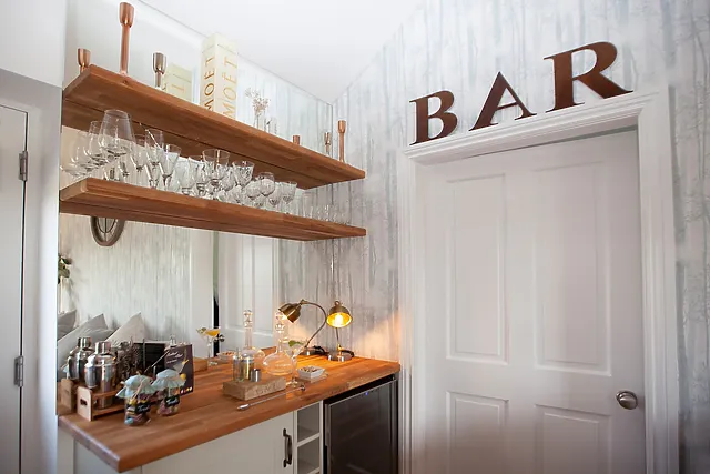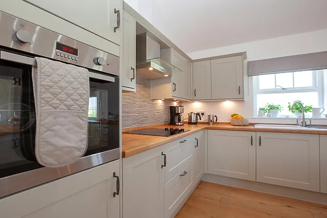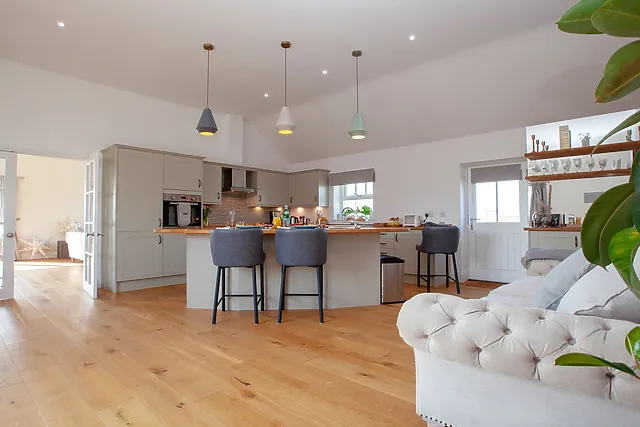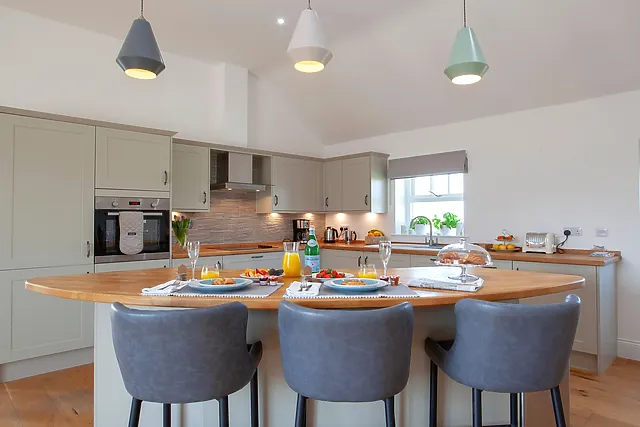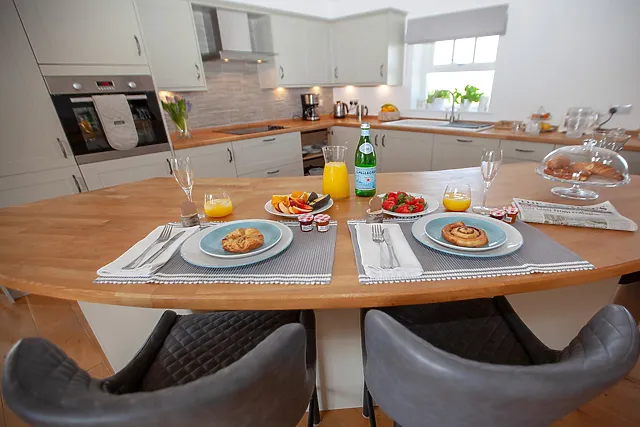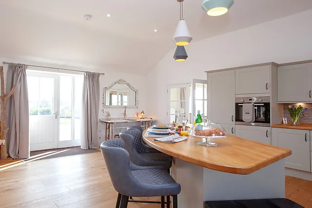 The cottage boasts a spacious, well-equipped kitchen with a breakfast bar, ideal for preparing romantic meals.