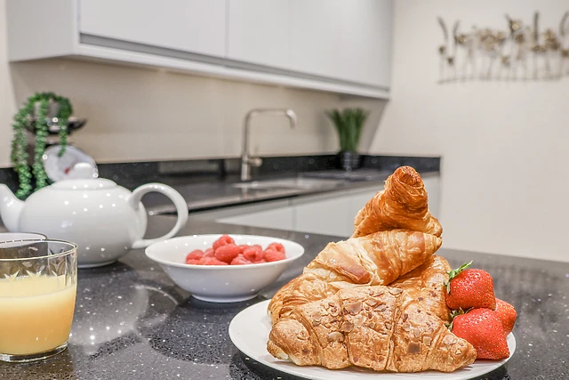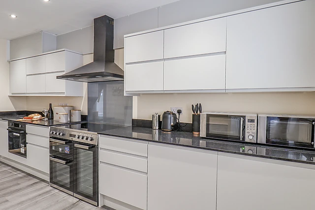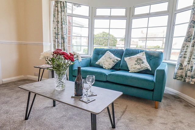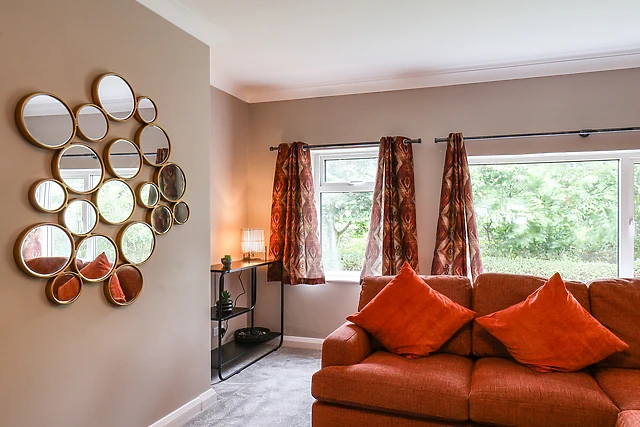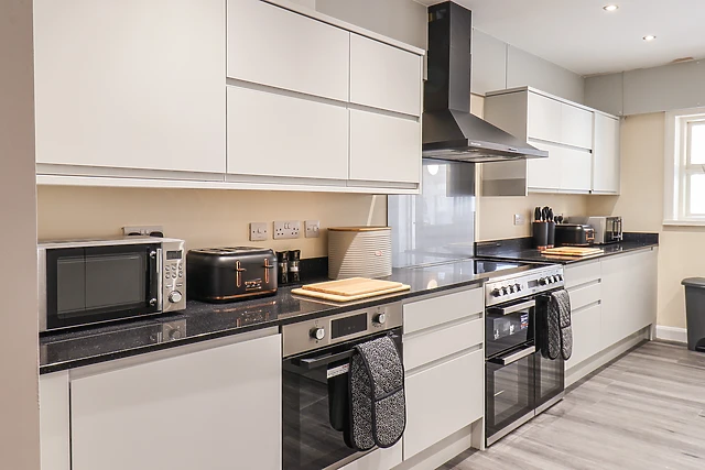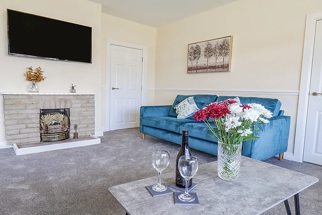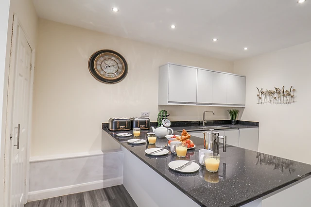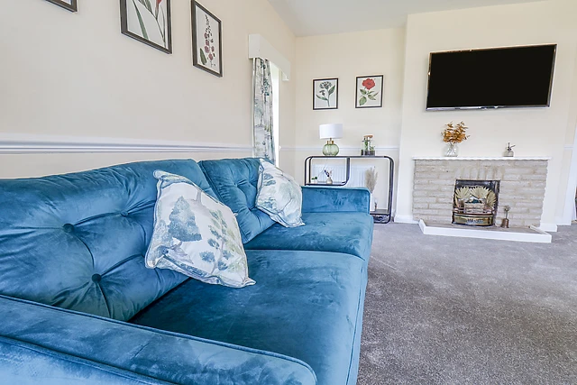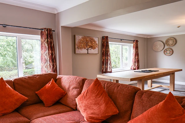 Once you've parked up and unloading your belongings, be welcomed into the home, starting off in the front sitting room, complete with a lovely bay window, large luxury sofas, and a TV, whilst the second sitting room which also has a TV, offers a wonderful nook to relax with a good book in hand or to enjoy an hour’s peace and quiet from the excitement of the group. Fully equipped for a self-catered stay, the kitchen features sleek cabinetry and appliances, offering a lovely space to prepare meals, ready to be enjoyed in the outstanding dining room where all guests can be seated together.