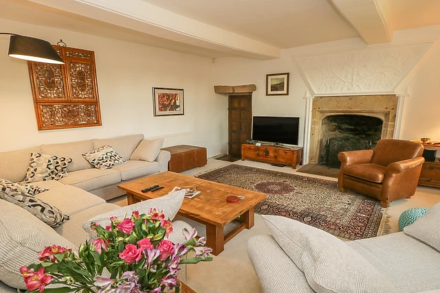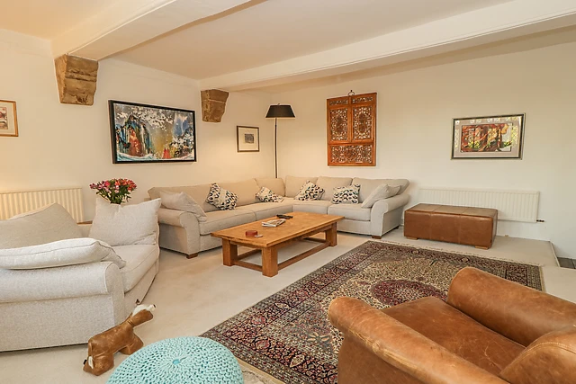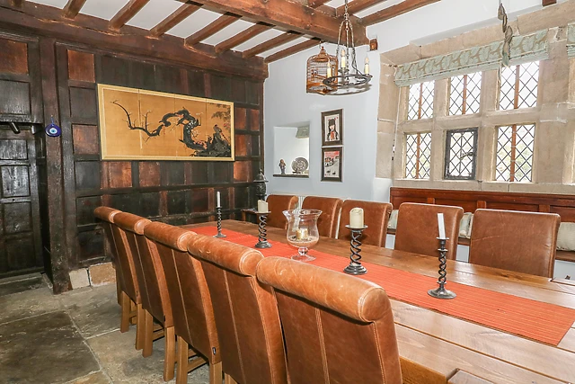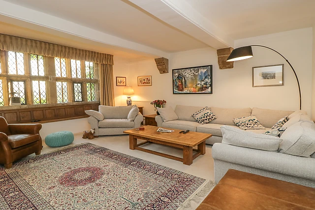 This imposing building is a real throwback to bygone days, with moulded stone copings, wood panelling, mullioned windows, flagged floors, old oak beams, original plasterwork, yet its sympathetic evolution and restoration have equipped it with every convenience expected of modern family life, whilst preserving its gentle and familiar character. Providing spacious accommodation, the ground floor offers the centrepiece of the building, the Great Hall, featuring a 16ft ceiling, a diamond-shaped stone flag floor, large stone inglenook, wood-burning stove, baby-grand piano, and enormous south-facing mullioned windows that flood the room with sunlight.Overlooking the Great Hall is the Minstrels' Gallery, a great place to sit and read and take in the storied history of this impressive yet welcoming room.