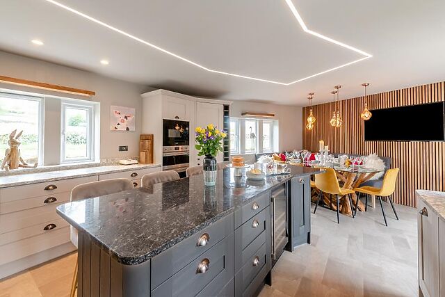 The heart of the home is the showstopping kitchen/diner, designed with entertaining in mind. The kitchen features high-end appliances, a sleek central island, and an opulent dining space.
