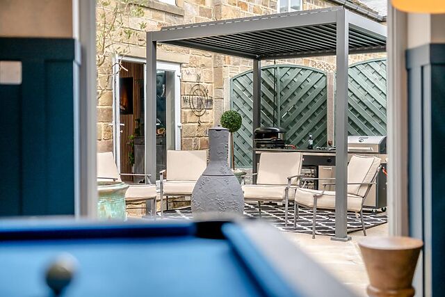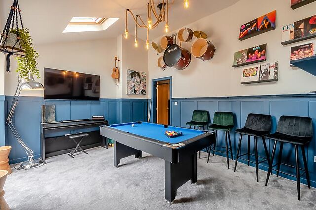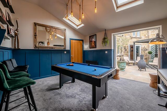 Doors lead out to the garden and outdoor kitchen, making al fresco dining a breeze. For added entertainment, head to the games room, where you'll find a pool table, games console, piano, and Smart TV.