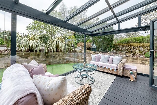 The chic lounge is a welcoming spot for cosy evenings, with soft seating, a Smart TV, surround sound, and a wood burner-effect gas fire. A bright and airy sunroom opens onto the garden, creating a lovely space to unwind with a coffee or a book.