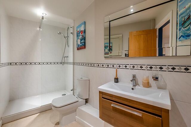 One super-king-size room is conveniently located on the ground floor, with access to a shower room. Upstairs, you'll find three further bedrooms: another super-king-size with an en-suite shower room, and two elegant king-size rooms.