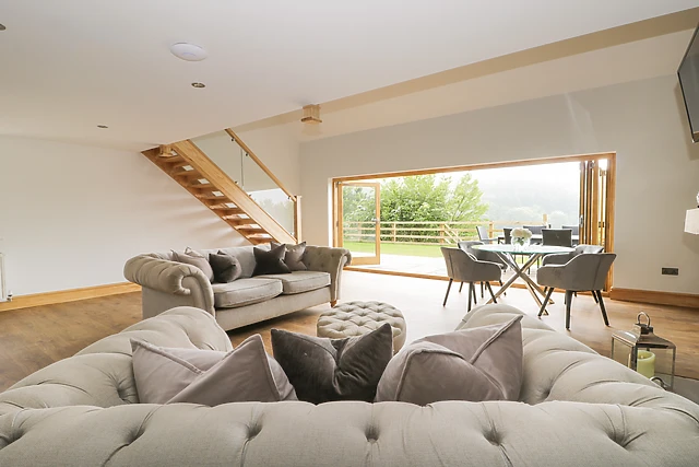 The lodge boasts a luxurious hot tub, where you can unwind and soak in the stunning views of the surrounding sheep-filled fields.
