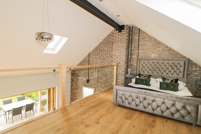 Retire to the king-size mezzanine bedroom after a day of exploration, ensuring a restful night's sleep. The property also includes a spacious wet room-style bathroom and an enclosed multi-level garden with lawn and patio furniture for alfresco dining.