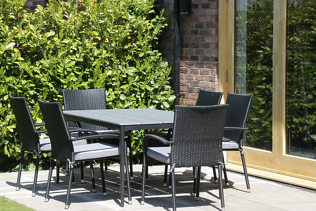 Yes, the property boasts an enclosed multi-level garden with a lawn and a patio area, complete with furniture for outdoor relaxation and dining.