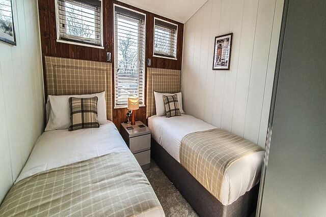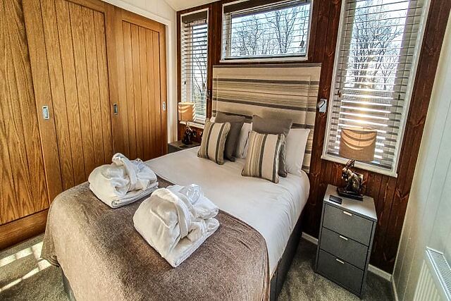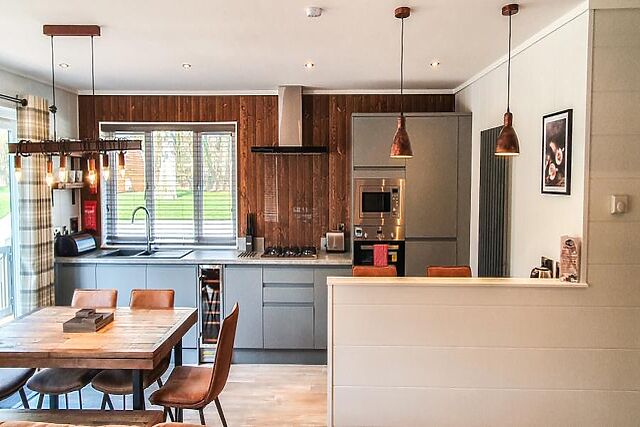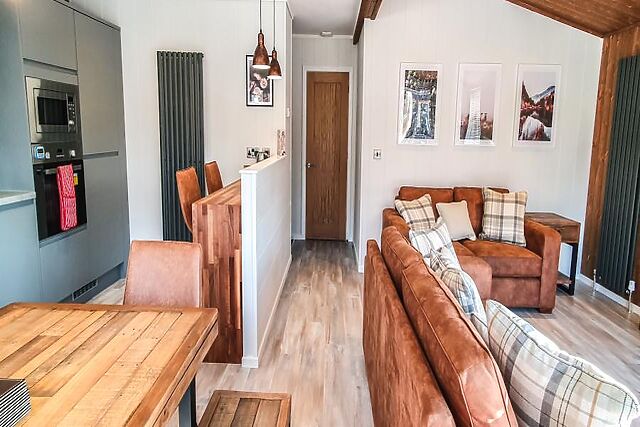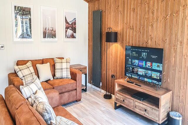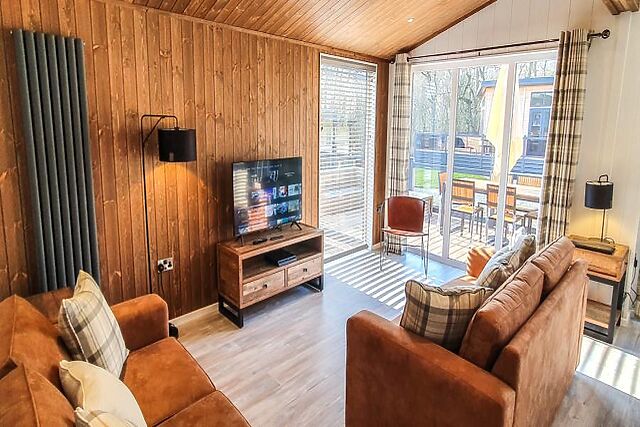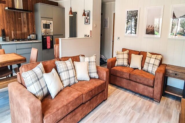 Step inside the lodge to find a thoughtfully designed holiday retreat where modern comfort meets tasteful design. The open-plan living area is decked with stylish wooden panelling and comfortable seating, including two inviting sofas and a statement chair, all centred around a large Smart TV.