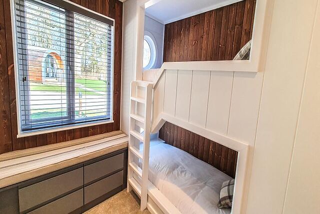 The three bedrooms are carefully designed, with the master bedroom boasting a king-size bed and an en-suite with a walk-in shower. A twin bedroom and a bunk bedroom, complete with unique porthole features for children, ensure ample sleeping options for all.
