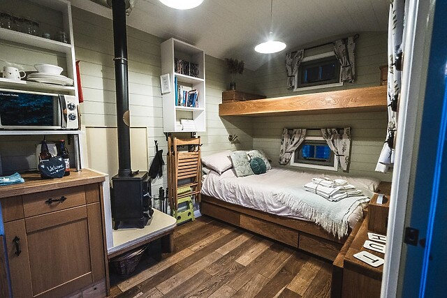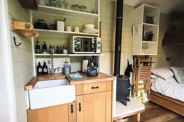Upon entering this single-storey abode, you will be greeted by a welcoming open-plan area, housing a kitchen with all the essentials needed to prepare a romantic meal for two. A fold-down table allows for intimate breakfasts while you listen to music on the DAB radio and docking station.
