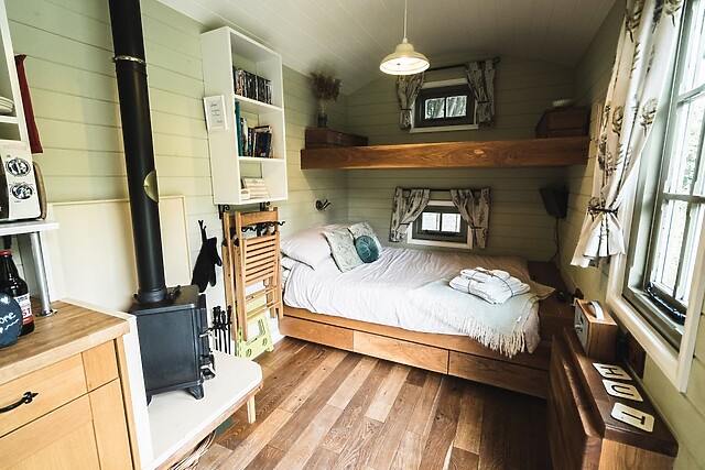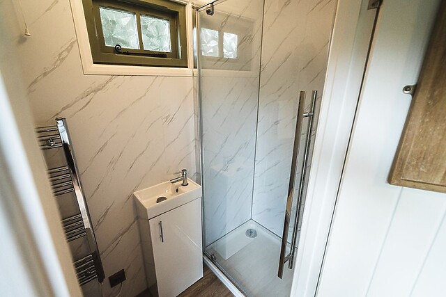 The double bedroom, complete with a TV and a warming woodburning stove, offers a snug spot to unwind after a day of exploration and is a perfect setting for those lazy mornings in bed. At the far end of the hut rests a sleek shower room, providing a convenient space to freshen up each morning and eliminating the need to trek to a communal toilet block!