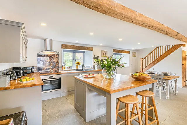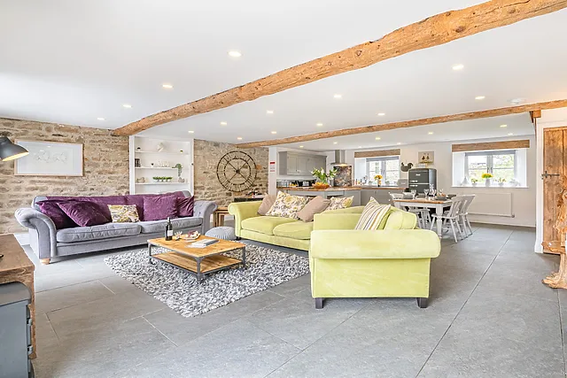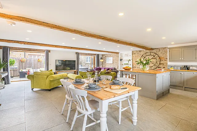 The open-plan living space exudes rustic elegance, complete with a farmhouse-style kitchen and a cosy breakfast bar.