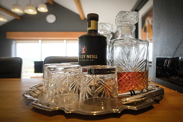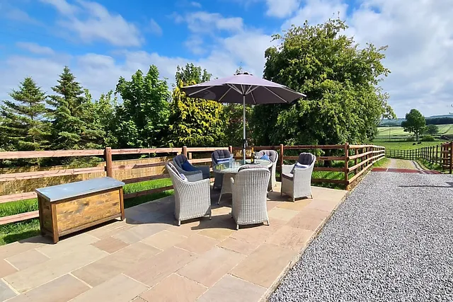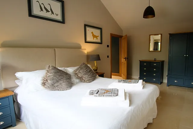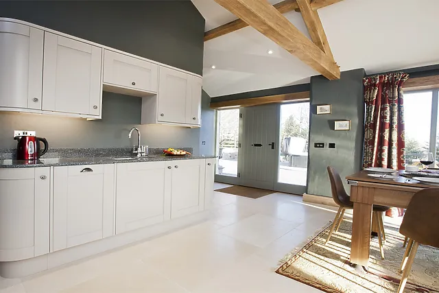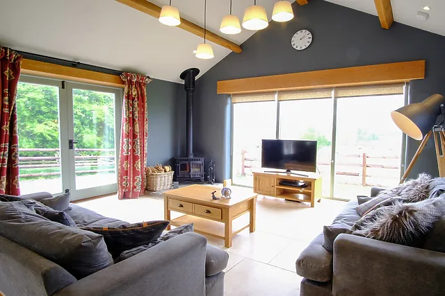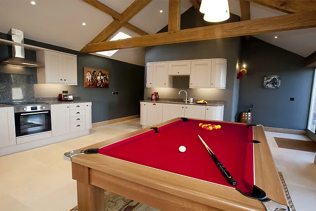 Inside, the open-plan living space is a haven of comfort, featuring a traditional wood burner, cosy sofas, and floor-to-ceiling windows that frame the stunning countryside vistas. The contemporary kitchen is fully equipped for your culinary adventures, and the dining table converts into a full-size pool table for evening entertainment.