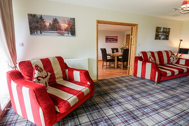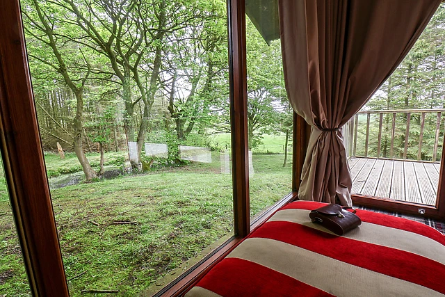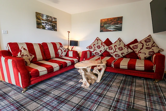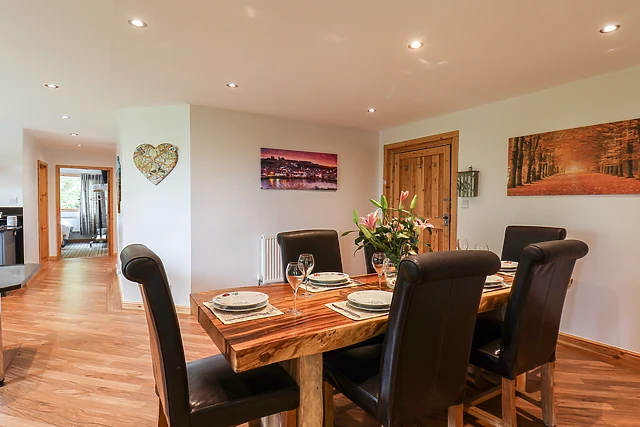 The wonderful rural views wrap around the open-plan living area, red layered sofas rest before a woodburning stove, and floor-to-ceiling windows invite the outside in. Unwind here, or even relax on the decked terrace area with a glass of something refreshing whilst the children make the most of the Xbox and Blu-ray player.