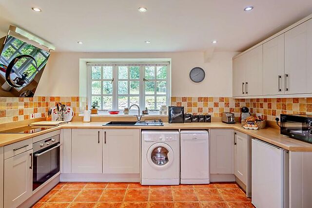The kitchen is fully equipped with modern appliances, including an oven, hob, washing machine, dishwasher, fridge, and microwave, ensuring you have everything you need for a comfortable stay.