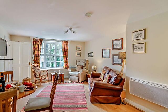 The cottage boasts a luxurious king-size bed, an en-suite bathroom, and an inviting open-plan living area with a comfortable leather sofa and flat-screen TV.
