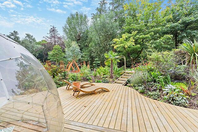 Enjoy a relaxing soak in the wood-fired hot tub or unwind in the sauna. The garden features elevated decking areas, an eco pod, and a summer house with a BBQ and wood burner, perfect for al fresco dining.