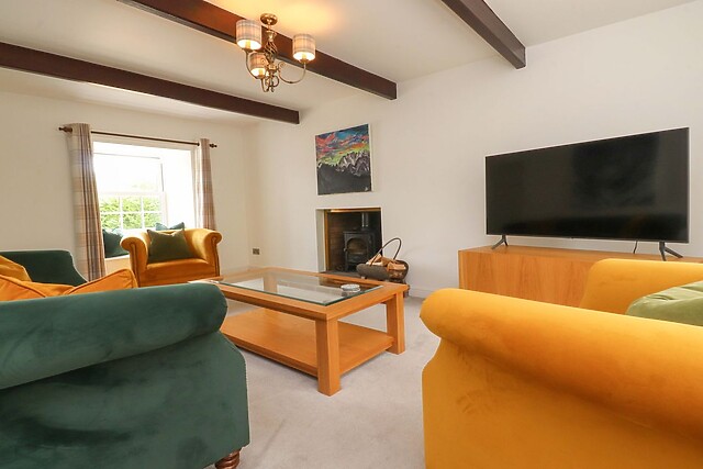 The cheerful dining room, seating six, invites you to gather for meals and conversation, surrounded by tasteful décor and countryside charm. After dinner, unwind in the inviting sitting room, where a woodburning stove casts a gentle glow across the room.