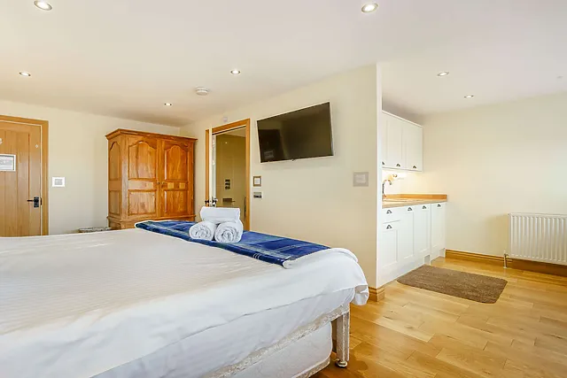 The property includes the Owl Suite, designed with increased accessibility in mind. It features a super king-size bed, an en-suite wet room with disabled facilities, and a separate entrance for wheelchair access.