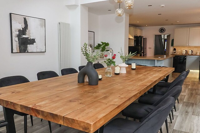 On arrival, leave your vehicle in a roadside space before entering this large home into the hallway, where you can house your shoes and jackets. The kitchen is contemporary in style and has everything you need with an Smeg range cooker with gas hob, two fridge/freezers, two dishwashers, and dining seating to enjoy mealtimes together.