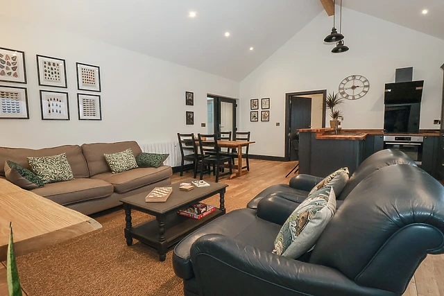 The open-plan living area, complete with a kitchen, dining space, and sitting area, is ideal for social evenings or quiet nights in.