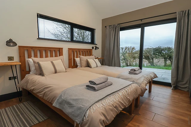 Skylark features two cosy bedrooms, one with a double bed and en-suite bathroom, and another with twin beds, ensuring everyone has a comfortable place to rest.