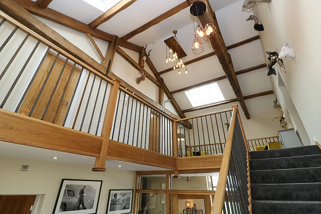 The interior boasts a stylish fusion of modern amenities and rustic charm, with exposed timber frames and a cosy woodburning stove.