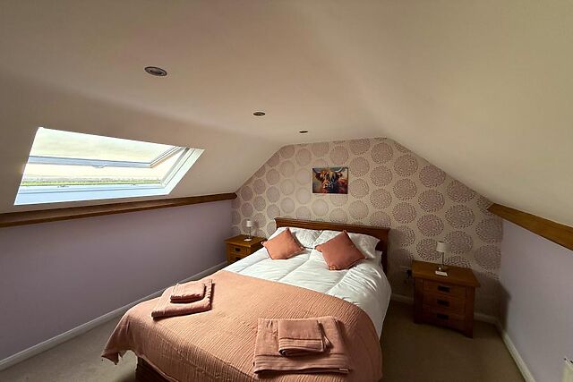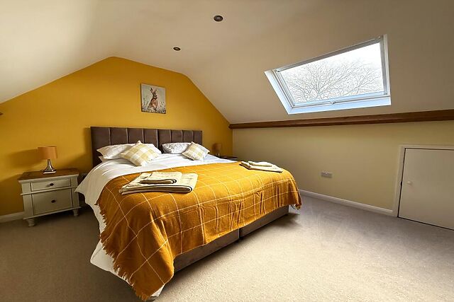 Upstairs, the fairly narrow and steep staircase leads to two further tranquil bedrooms, a super-king-size (zip-and-link) and a king-size, both with rural views and characterful sloping ceilings. All three bedrooms offer plenty of storage, Smart TVs and hairdryers, ensuring comfort and convenience throughout your stay.