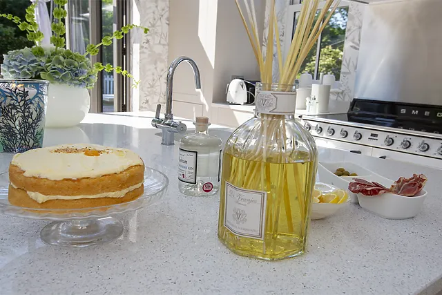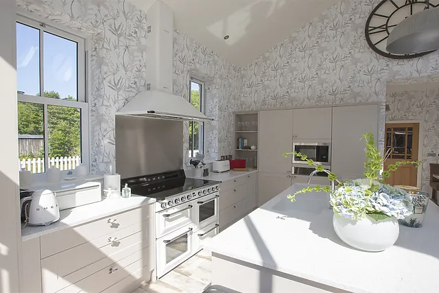 The kitchen is well-equipped with a range oven, induction hob, microwave, warming drawer, fridge, freezer, dishwasher, washer/dryer, coffee maker, and two wine fridges, catering to all your culinary needs.