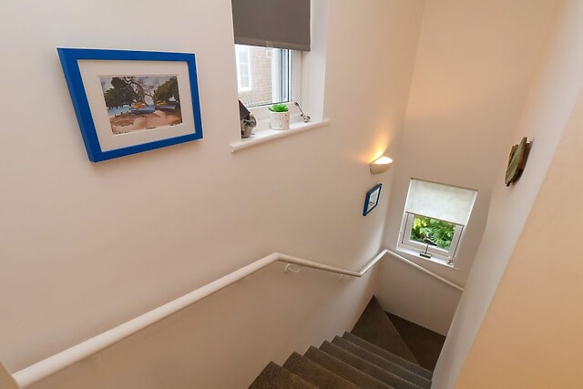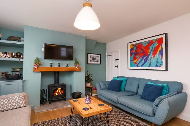 The kitchen is connected to the living room which boasts harbour views and a comfortable seating area, TV and fireplace with wood burning stove. The property has 3 bedrooms split over 3 floors.