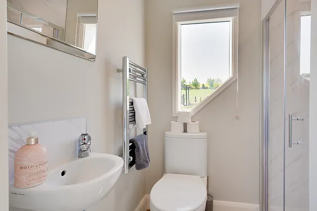 Inside, the open-plan lounge/kitchen/diner presents sleek cupboards and all the essentials for a cosy night in. The comfortable sofa and Smart TV are perfect for relaxing evenings, while the dining table sets the scene for intimate meals. The king-size bedroom boasts a fairy-lit four-poster bed, ensuring a magical slumber.